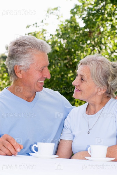 Счастливые пожилые супруги завтракают в саду