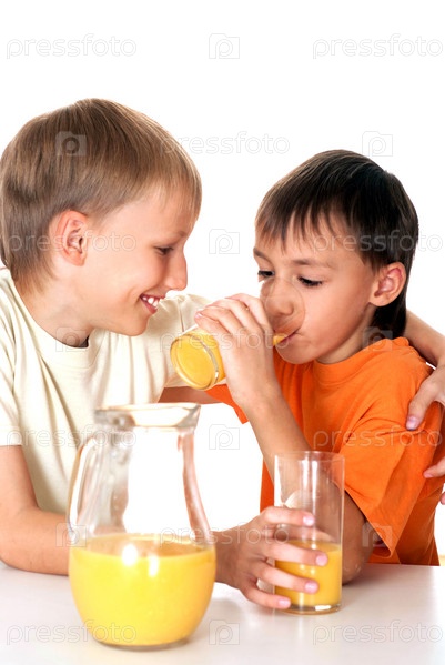 Два брата пьют апельсиновый сок
