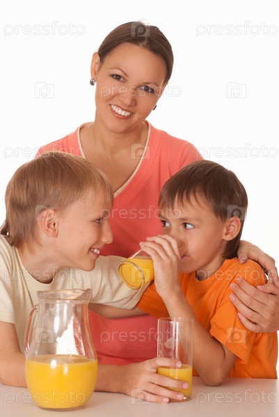 Два брата с мамой пьют апельсиновый сок