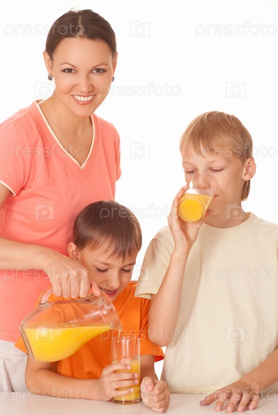 Два брата с мамой пьют апельсиновый сок