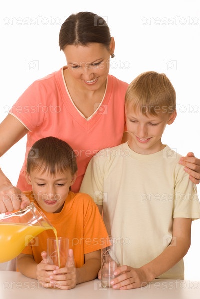 Два брата с мамой пьют апельсиновый сок