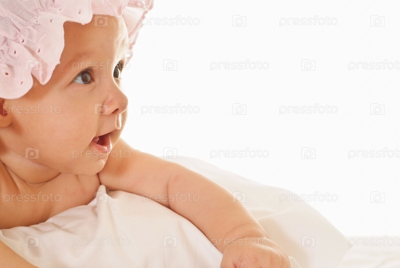 Маленькая девочка в чепчике на белом фоне