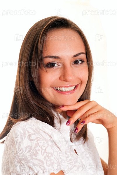 Привлекательная девушка в белой блузке на белом фоне