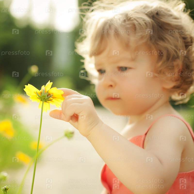 Красивый ребенок трогает желтые весенние цветы