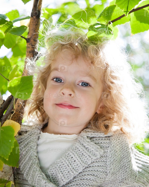 Красивый ребенок на фоне зеленых листьев
