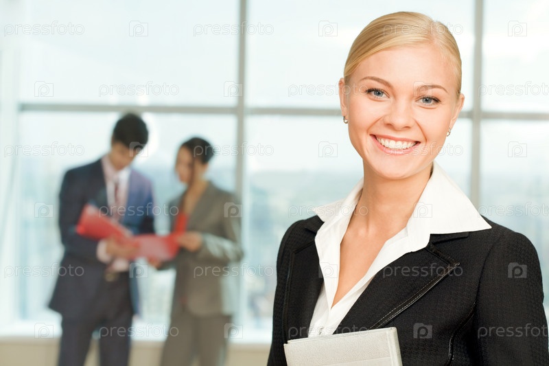 Портрет счастливой бизнес-жены, улыбающейся в камеру на фоне трудящихся