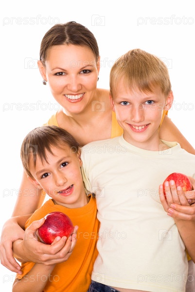 Мать с двумя сыновьями на белом фоне