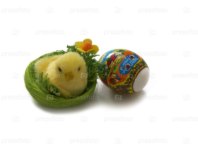 Пасхальные украшения: крашенное яйцо и цыпленок в корзинке