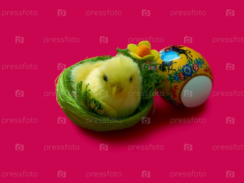 Пасхальные украшения: крашенное яйцо и цыпленок в корзинке на красном фоне