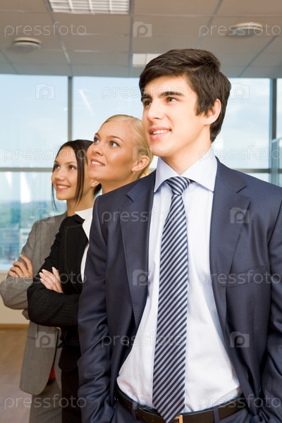 Красивые дамы смотрят в сторону с улыбкой за успешным лидером