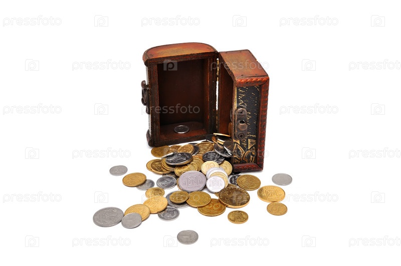 Перевернутая деревянная шкатулка с рассыпанными монетами