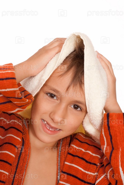 Мальчик вытирает голову полотенцем, белый фон
