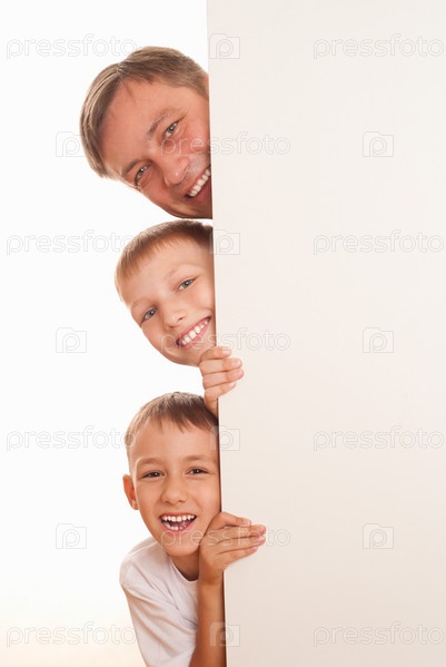 Отец с сыновьями выглядывают из-за белого листа