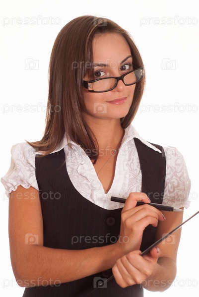 Привлекательная женщина в очках с планшетом и ручкой на белом фоне