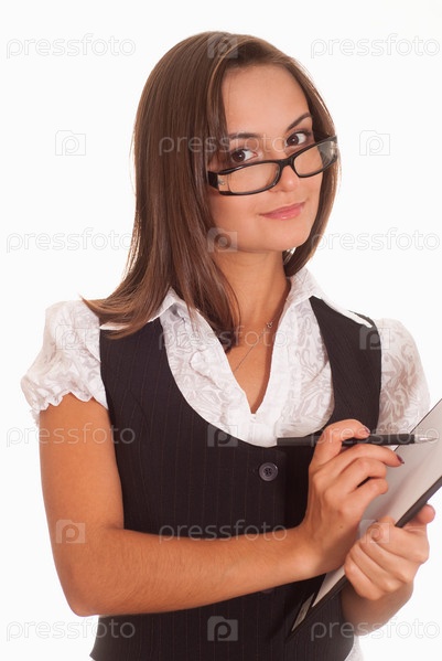 Привлекательная женщина в очках с планшетом и ручкой на белом фоне