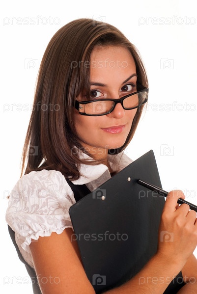 Привлекательная женщина в очках с планшетом и ручкой на белом фоне