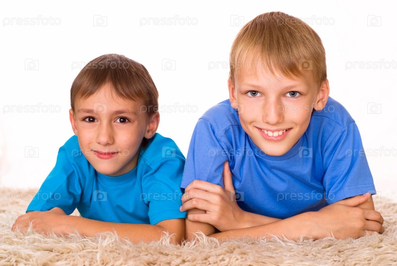 Два брата лежат на полу, на белом фоне