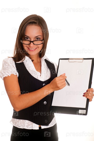 Привлекательная деловая женщина с планшетом и ручкой на белом фоне