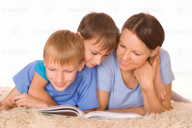 Два мальчика с мамой лежат на полу и читают книгу