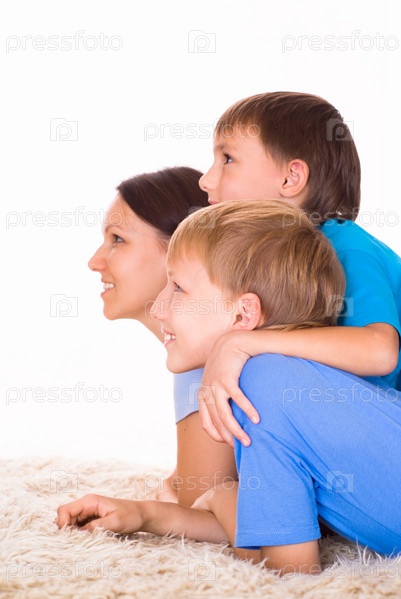 Мама с двумя детьми на белом фоне