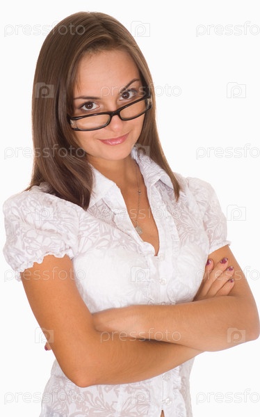 Привлекательная девушка в очках и белой блузке на белом фоне