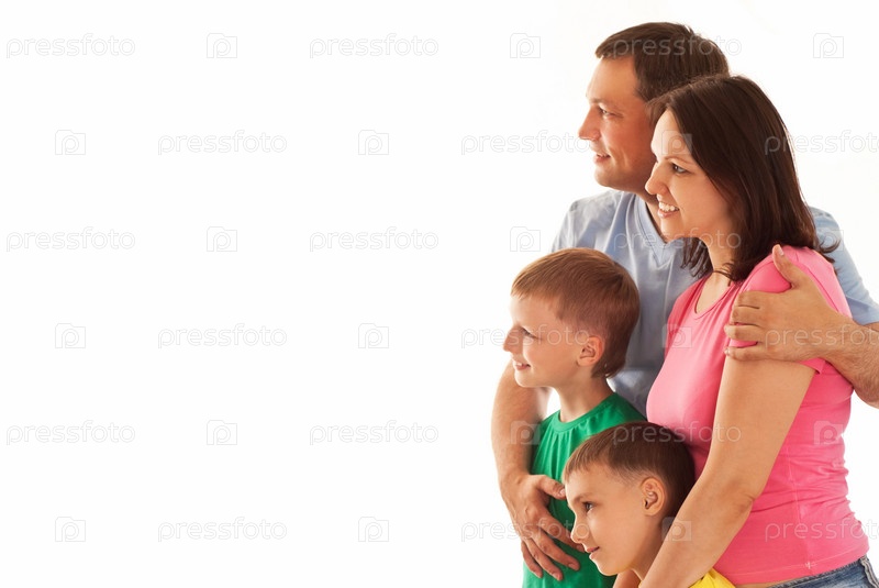 Счастливые родители с двумя сыновьями на белом фоне