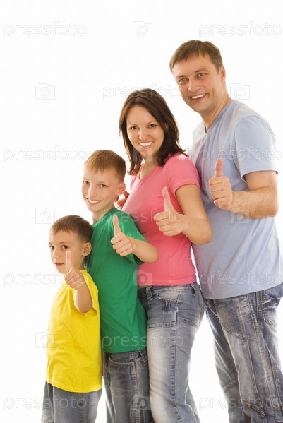 Счастливые родители с двумя сыновьями на белом фоне