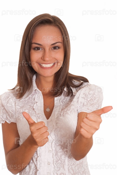 Веселая девушка в белой блузке показывает большие пальцы на белом фоне