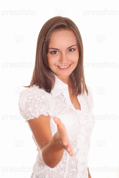 Девушка в белой блузке протягивает руку для рукопожатия на белом фоне