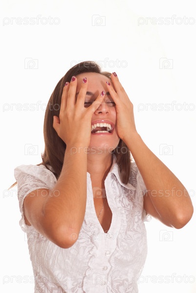 Девушка кричит, закрывая лицо руками, на белом фоне