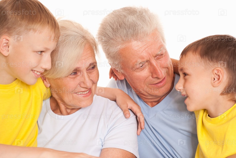 Бабушка и дедушка с внуками на белом фоне