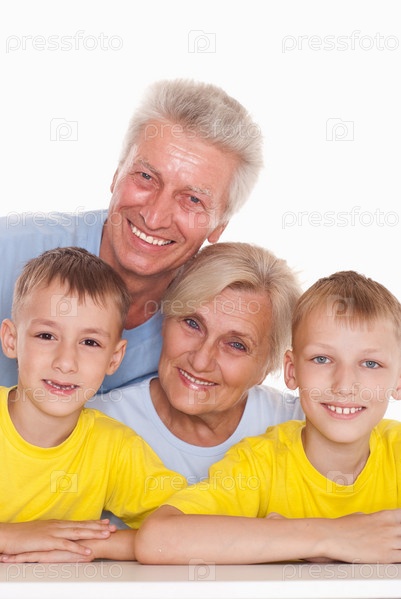 Бабушка и дедушка с внуками на белом фоне