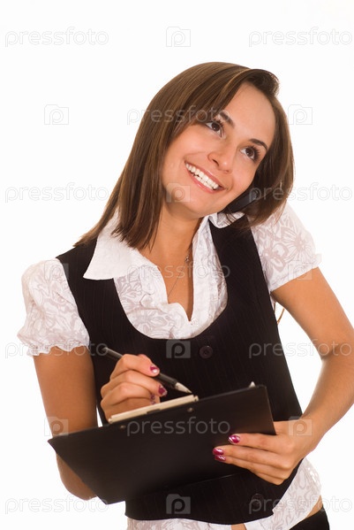 Привлекательная женщина говорит по телефону и пишет на планшете, белый фон