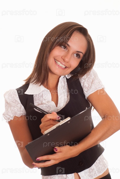 Привлекательная женщина говорит по телефону и пишет на планшете, белый фон