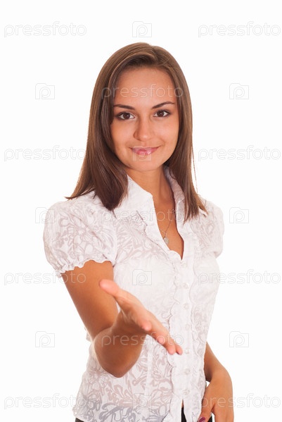 Девушка в белой блузке протягивает руку для рукопожатия на белом фоне