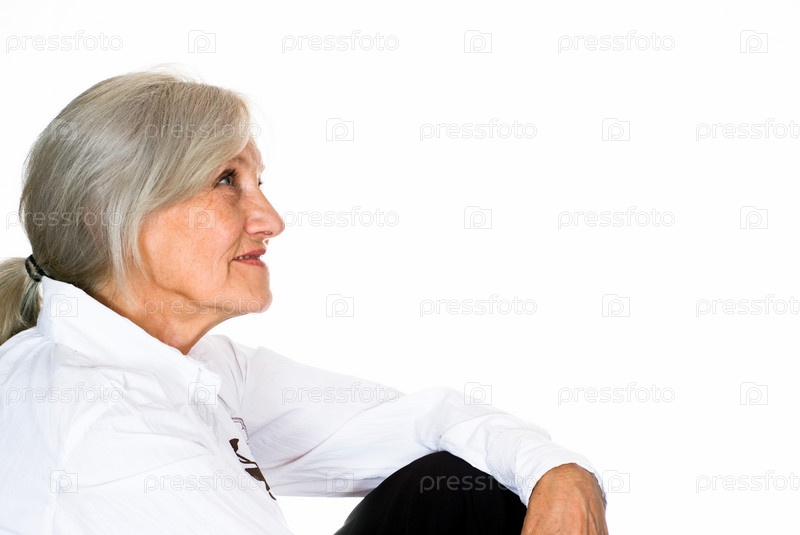 Красивая пожилая женщина смотрит на место для текста