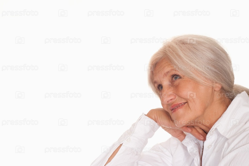 Красивая пожилая женщина смотрит на место для текста