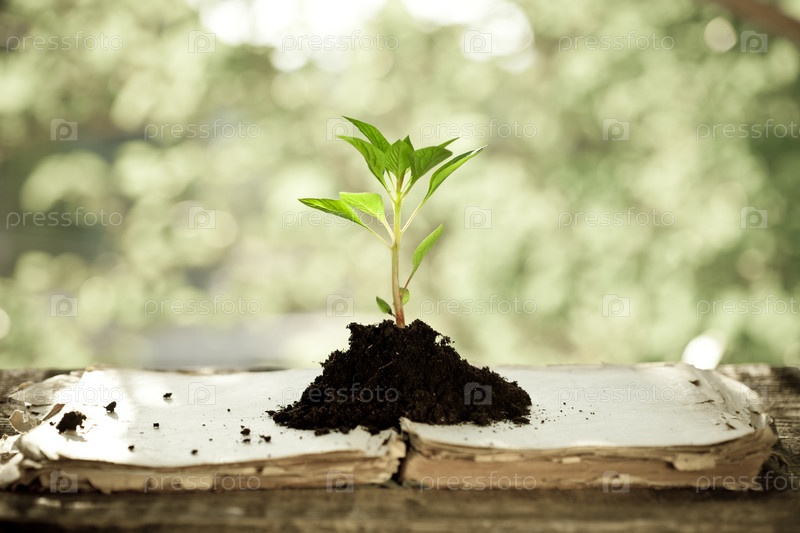 Молодое растение на старой книге. Концепция экологии