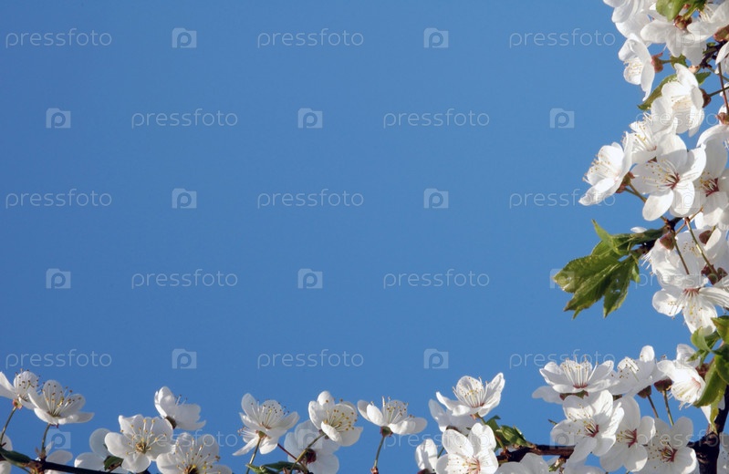 Весенние белые цветы на голубом небе