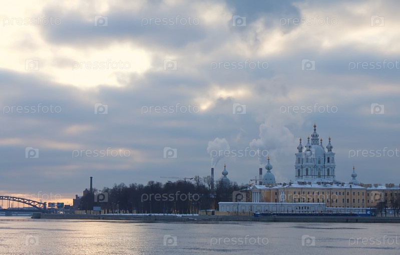 Россия, Санкт-Петербург. Смольный собор (храм Воскресения) и река Нева