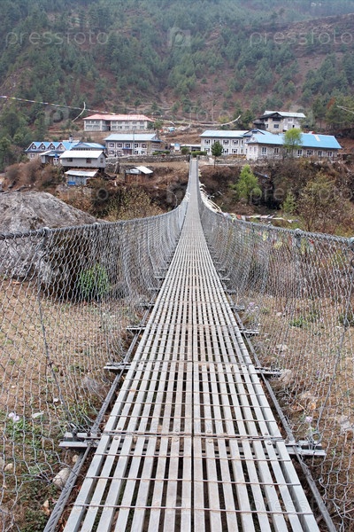 Подвесный мост через реку Дудх Коси в деревне Пхакдинг, поход на Эверест, Гималаи, Непал