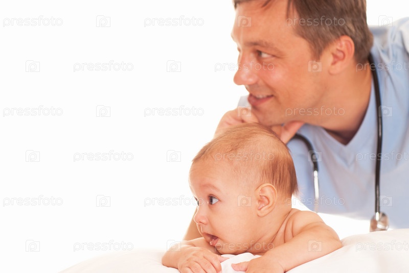 Доктор с новорожденным ребенком на белом фоне