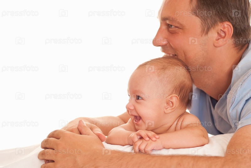 Отец со своим новорожденным ребенком лежат на белом
