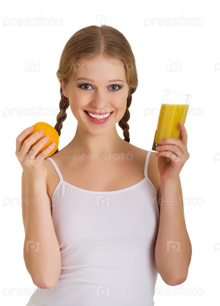 Красивая молодая девушка с апельсином и стаканом сока, изолированная на белом фоне