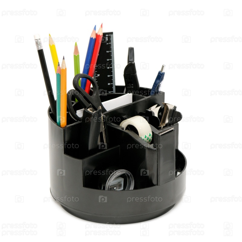 Канцелярские товары в подставке, изолированные на белом