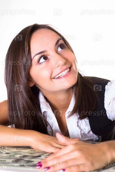 Счастливая женщина с деньгами на белом фоне