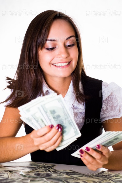 Женщина считает деньги на белом фоне