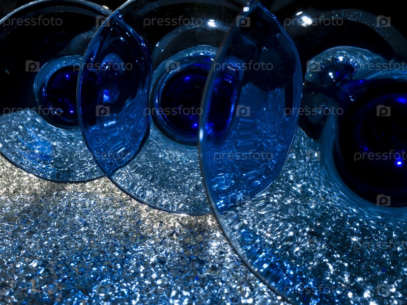 Стеклянные бокалы с темно-синей ножкой на фоне хрусталя