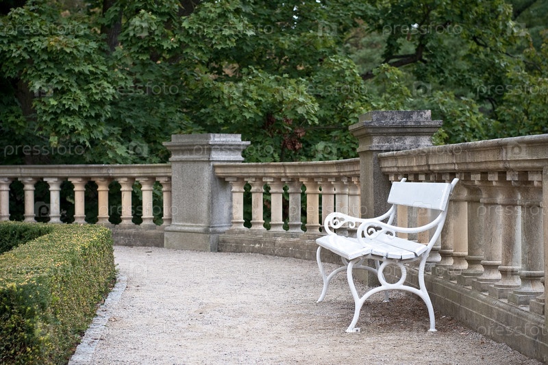 Терраса с скамейкой для отдыха на тропинке, замок Конописте, Чехия