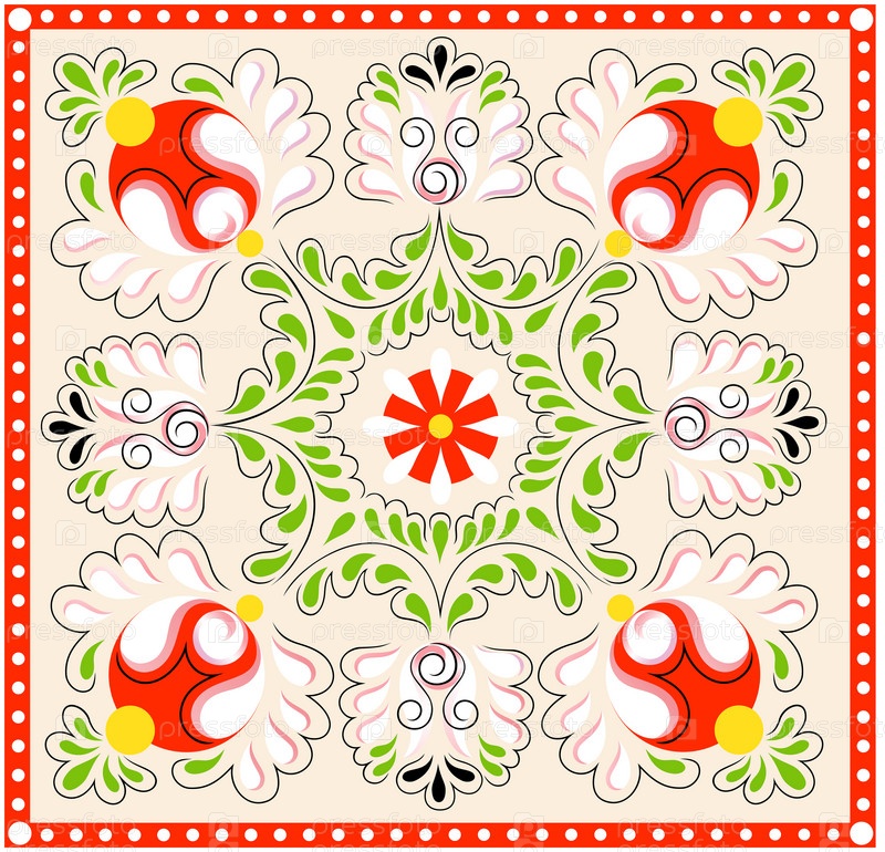 Квадратная иллюстрация с русской традиционной Онежской росписью из розанов с листьями